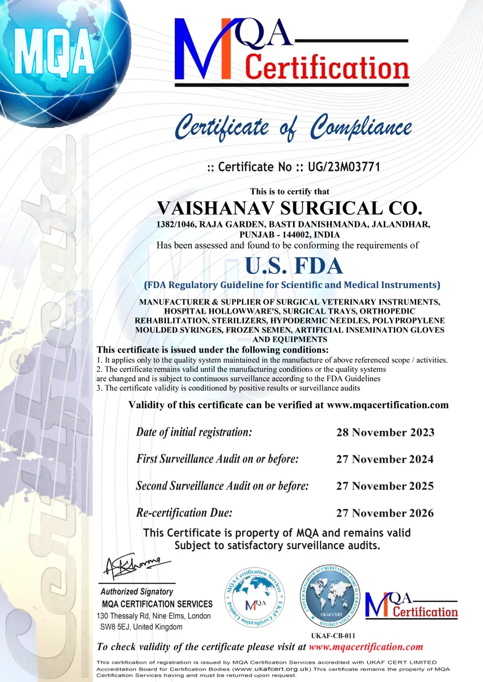Vaishanav Surgical Co. is committed to delivering high-quality surgical instruments and medical equipment that meet international standards. Our certifications reflect strict quality control, precision manufacturing, and compliance with global healthcare requirements.